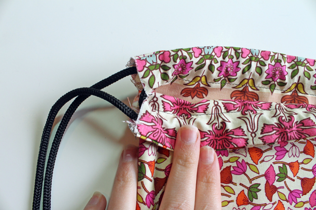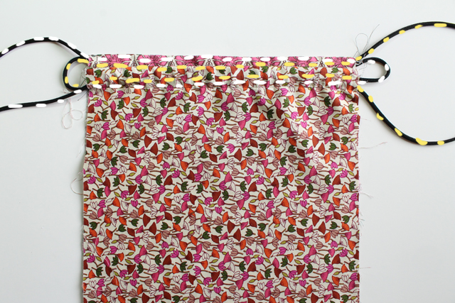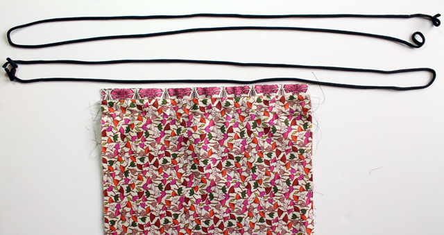 7. Taking 1 end of 1 of your cording pieces, pin a safety pin onto the end (to help thread it through) and starting on the left, thread it through the back tube and then back through the front loop so that both ends of the cording are on the left side.