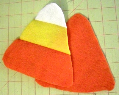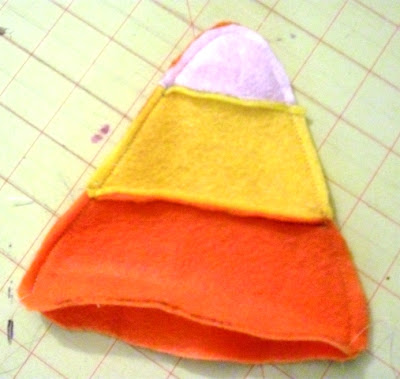 4. Lay the candy corn pattern of the sewn stripes and cut out the shape. Put right sides of front and back pieces together and sew up the sides and tip of the candy corn, leaving the wide end OPEN.