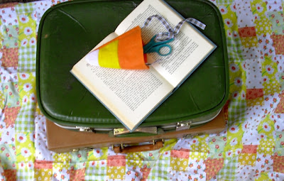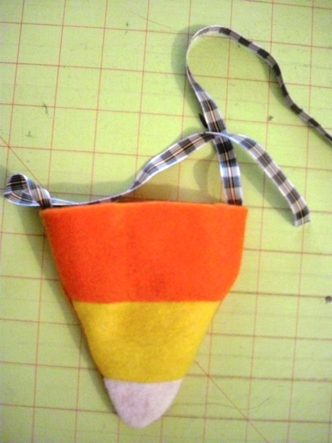 5. Attach ribbon to each corner of the top (the wide end) and cut ribbon in half. Fold Candy Corn right side out, and fill with your scissors, hang in your craft area!
