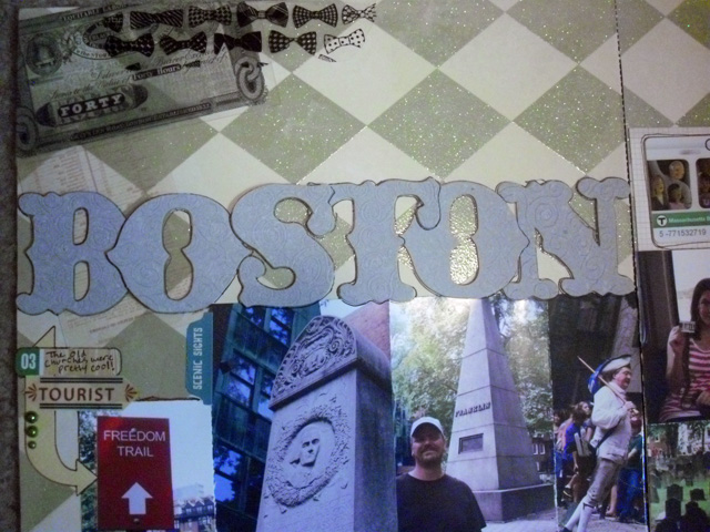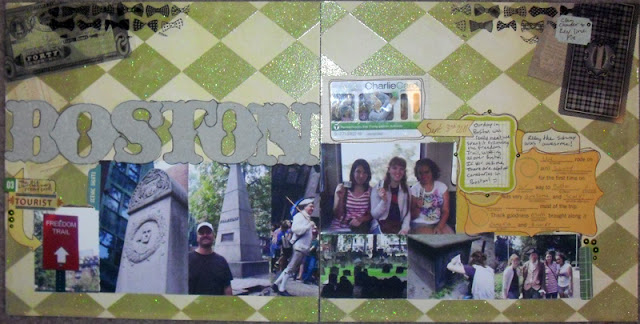 As I was about to scrapbook my pictures from Boston, I remembered Creating Keepsakes October Recipe Challenge. You had to use glitter, at least 8 photos(including a detailed photo), the color yellow, and a pen.