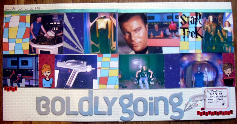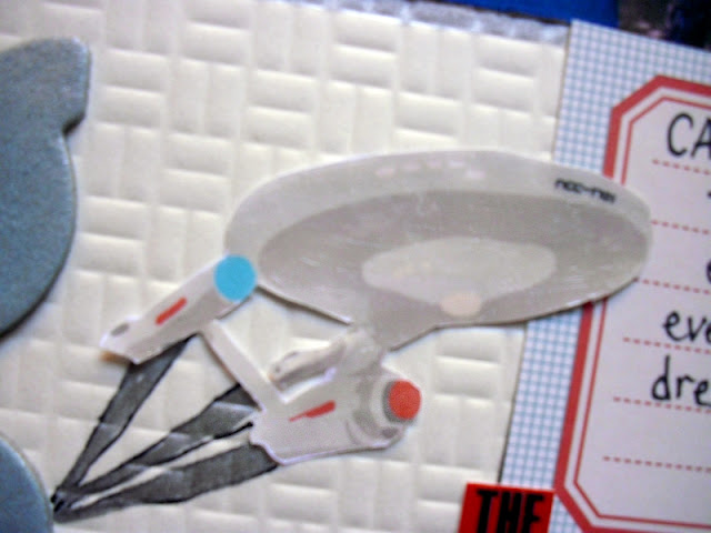 On my layout, you will find some embellishments that I drew in photoshop (using my Bamboo tablet) and then printed out and attached to my layout. These include the little Star Trek Girls, the Enterprise and the bright pieces of patterned paper.