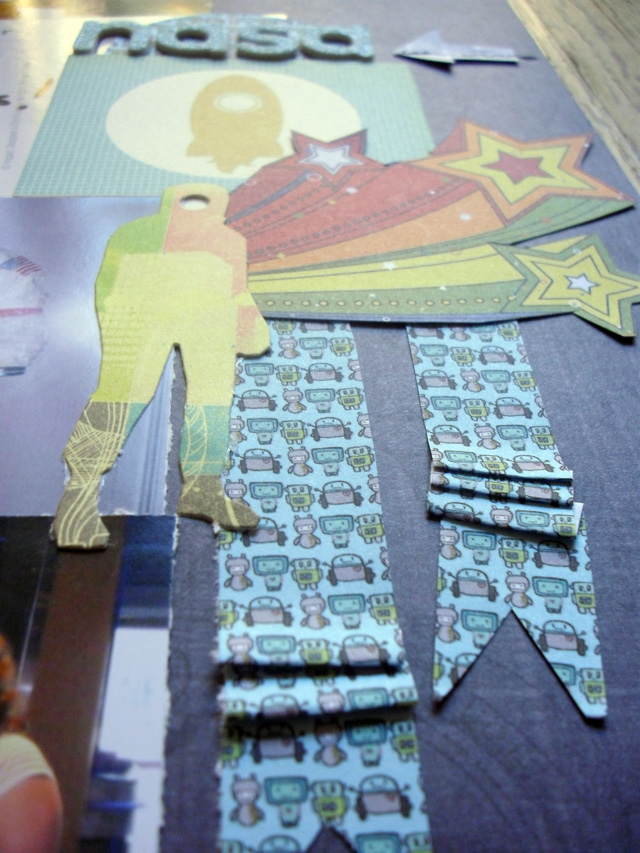 For this layout, I knew I wanted a really big rocket so I painted one on. ;) I also had some stickers that I had designed in photoshop a while back (using my bamboo tablet) which I printed out and glued on. Those are the planets, starbursts, and the robot tape strips..