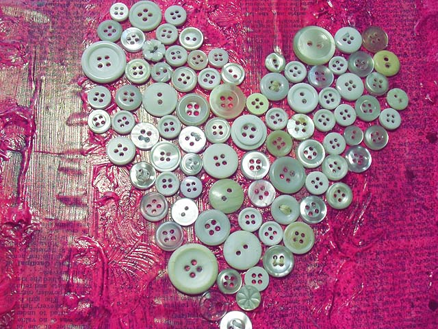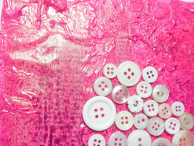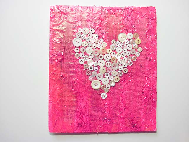 It started out as a white canvas, which I glued a few book pages to, and then painted over using pink paint mixed with a heavy gel medium. Then I misted it with some pink Tattered Angels spray mists and after it was all dry I glued buttons onto it.