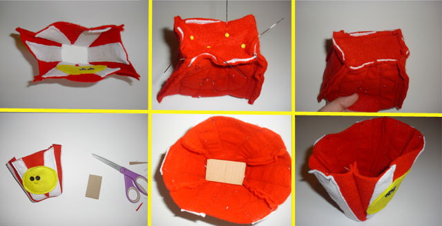 4. Stand your bucket up onto a piece of red felt and measure of big the bottom needs to be. With your bucket inside out, pin the bottom piece to the bucket. Stitch them together. This is easiest with a needle and thread, but it is possible to do it with the sewing machine. (I know, because I did it. haha)