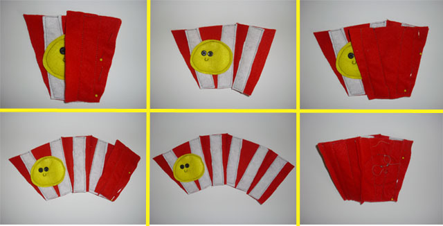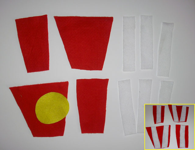 1. On my pattern, you sill see a front piece and a side piece. cut 2 of each of these out of red felt. There will also be an oval shape-Cut that out of yellow felt. Also cut six 5"x1" strips of white felt.