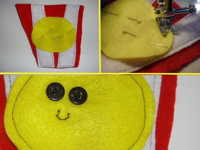 2. Pin the yellow oval onto the front piece of your popcorn bucket. Sew around the edge.