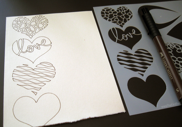 the stencil design along the left edge of a 5.5”x4.25” card with pen.