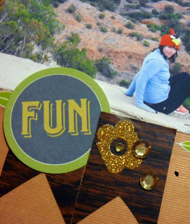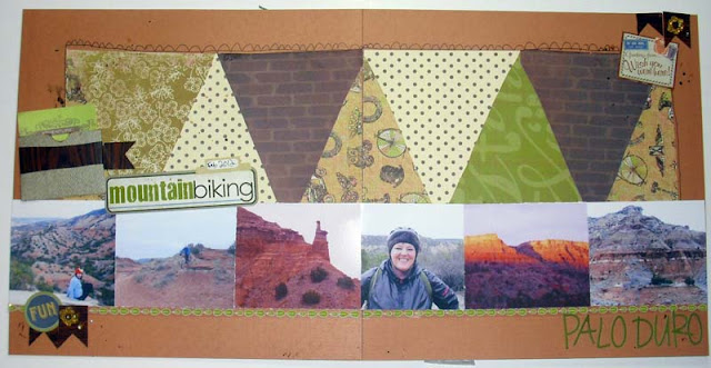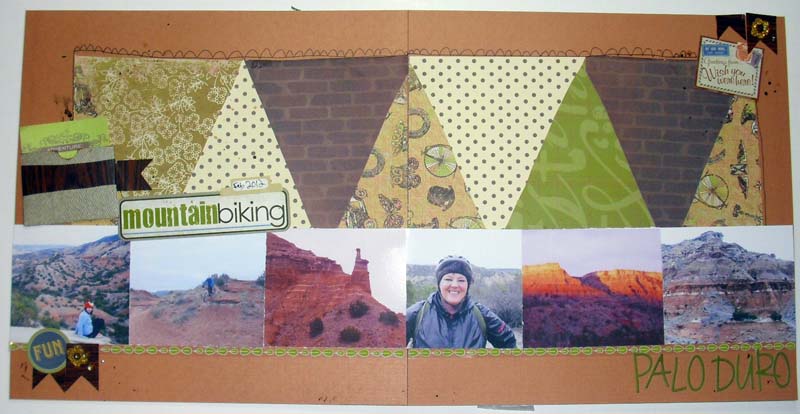 I had a few leftover triangles from when I restyled my bulletin board, So I decided to use them on a scrapbook layout with pictures from Palo Duro Canyon. (We went camping a couple of weeks ago.)