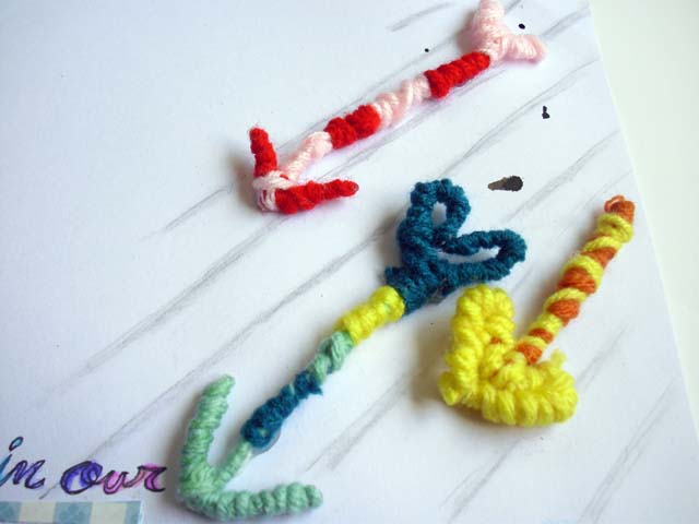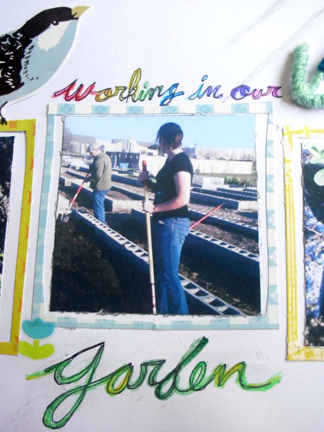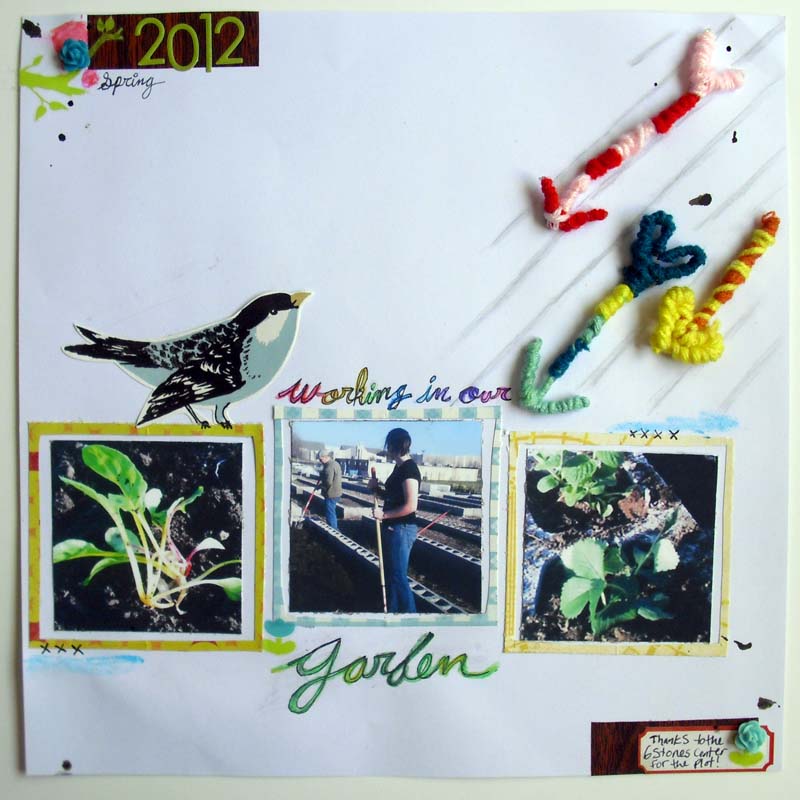 This layout I made for the February Pinterest Challenge on ClubCK turned out super artsy. I created the arrows by wrapping yarn around wire. I also used water color pencils for my title, and splattered some walnut ink.