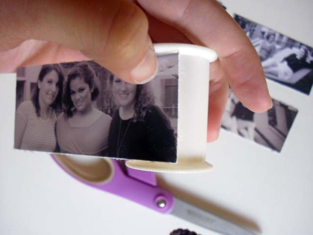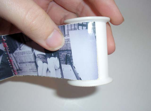 4. Taking the edge of your photo strip and your spool, use a strong adhesive to attach the edge of your photo to your spool. Let dry.