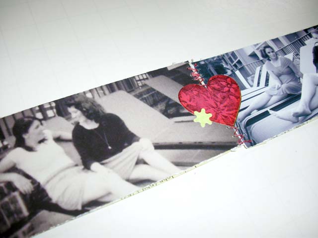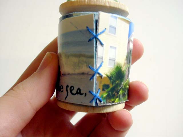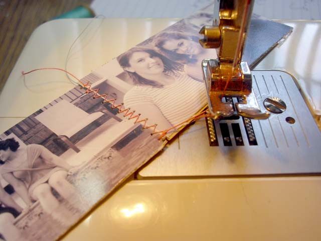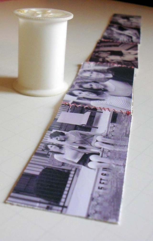 NOTE- there are many ways that you could bind this. I chose to sew them because I thought it went good with the spool. Another way you could do it is by sticking washi tape on the 2 photos.