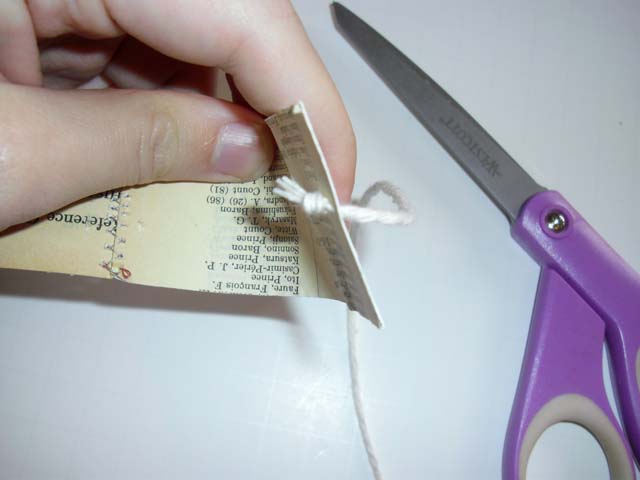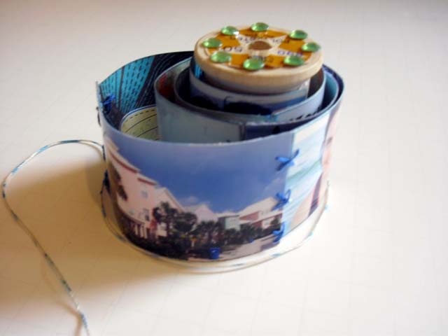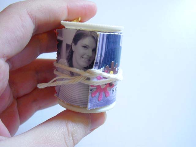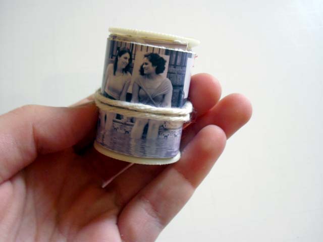 Wrap your photos around your spool (tightly!) and then continue wrapping around it with the string. When you get to the end of your string, just wrap it under itself to make it stay.