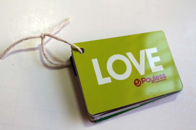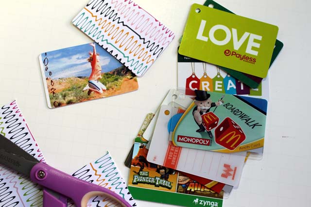 Supplies: Old Gift Cards, Hole Punch (I used a crop-o-dile), Pretty Papers, Pictures, Scissors, Twine or Ribbon.