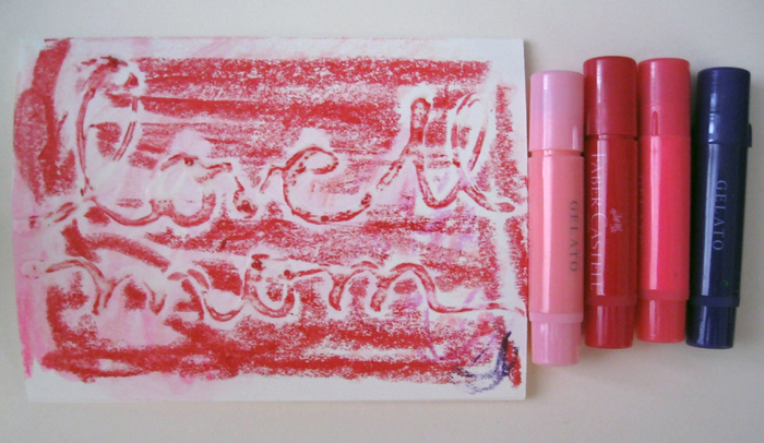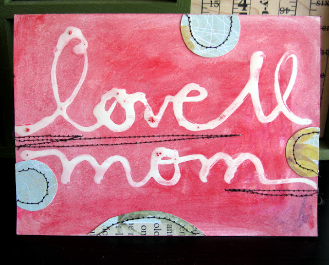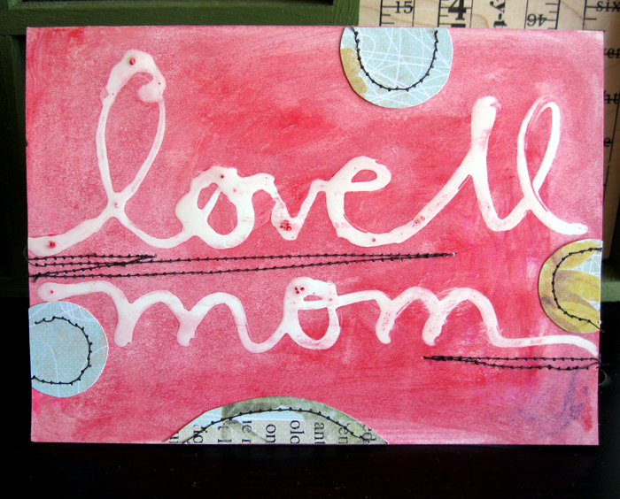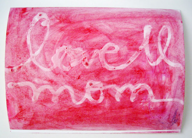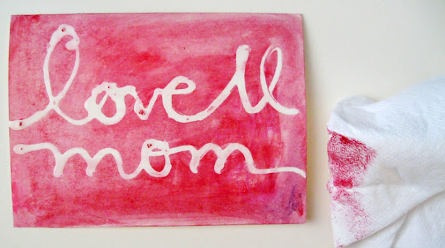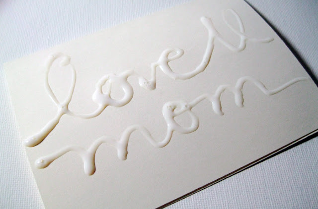 Use liquid glue to write the sentiment. I used Scotch 3M Quick Dry adhesive. Let glue dry completely. When it dries, it will work as a resist.