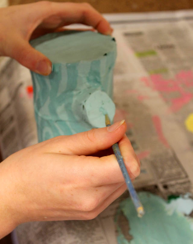 5. Paint your logs using acrylic paints. Depending on the color paint you use, it might take more than one coat to completely cover the newspaper. We did 2 coats of paint. Let that dry.