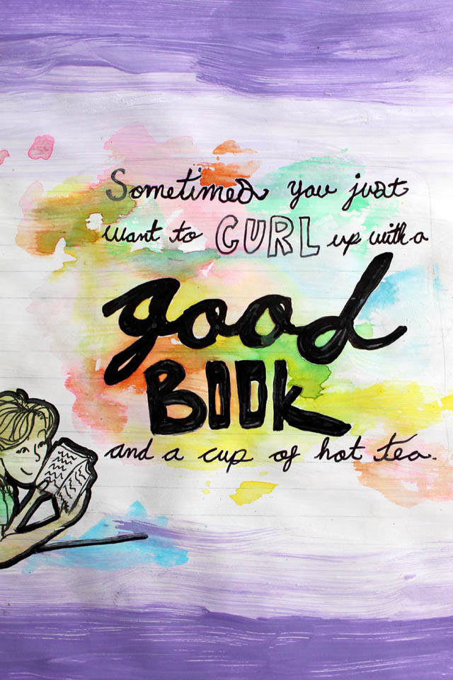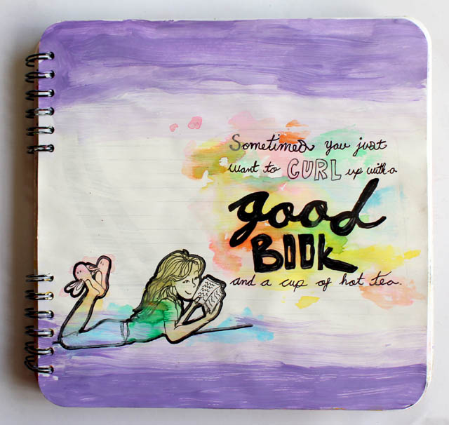 I started by painting the background white and adding purple along the edges. Once that was dry I doodled the little girl, wrote out my quote and then got messy with water colors.