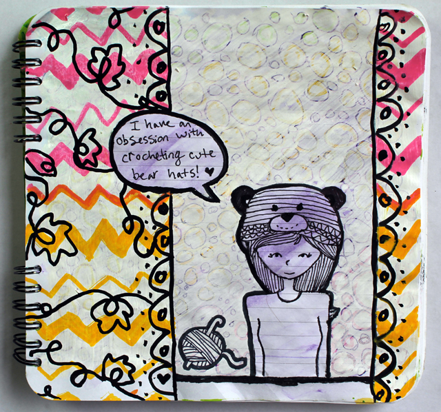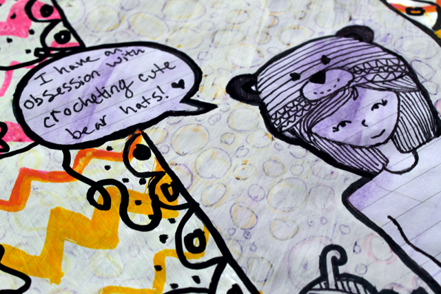 I started by doodling my little girl wearing the bear hat and my speech bubble, then I drew those little circles over the entire page, I went over them with a light coat of white paint to tone them down. After the white paint was dry, I drew the pink and yellow chevrons with Posca markers. To give my page a finished look I went crazy with my black marker.