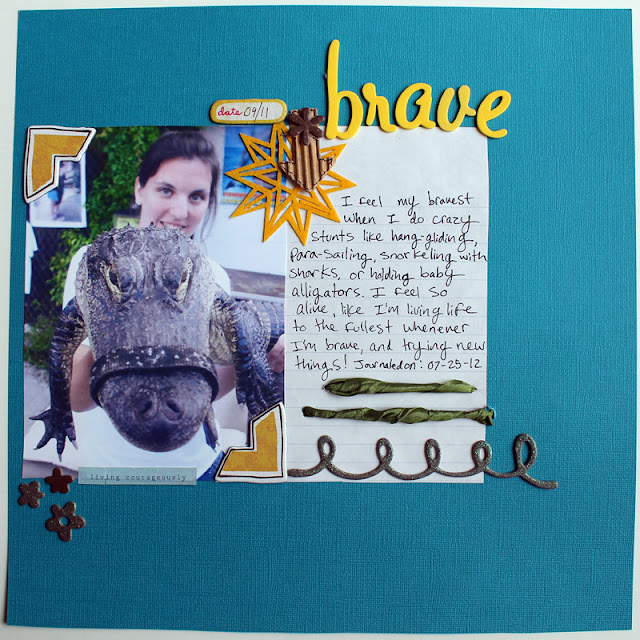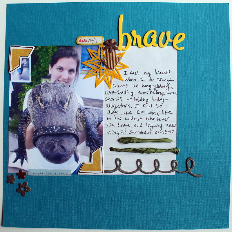 I used the Courage kit from CreateU Visual Journaling for this layout. My favorite things about it are probably that golden yellow felt star die cut and the corrugated cardboard arrow. So much lovely texture!