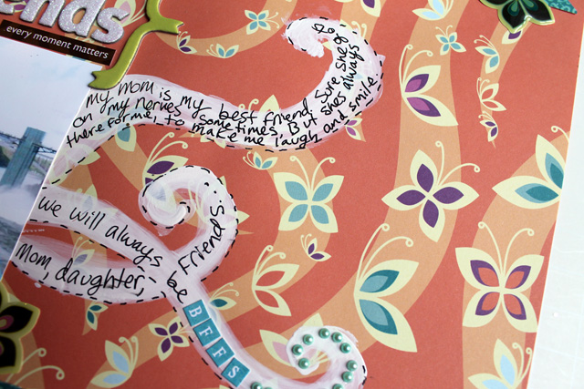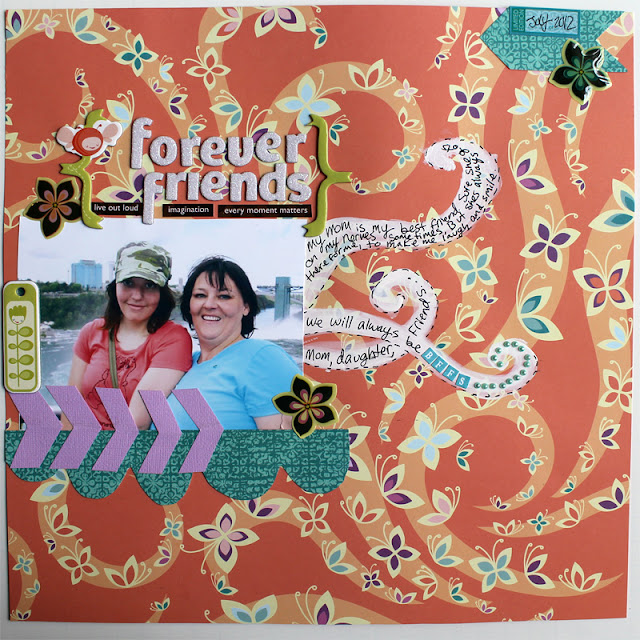 For today's layout, I used the Friendship Kit. I loved the colors and embellishments in this kit, especially the background paper I used for this page. It is so whimsical and fun! I used a picture of my Mom and I, We're pretty much BFFs. ; )