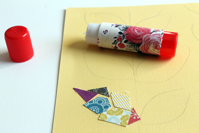 4. Using a glue stick, glue your paper scrap mosaic tiles down on to your design. I tried to fit mine nicely but there are some places where I just couldn't find the right shape. It still looks fine though.