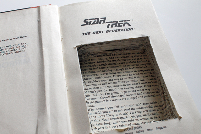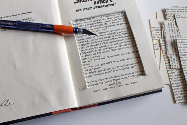 2. Using your craft knife, Cut along the lines you drew, removing pieces of the pages.