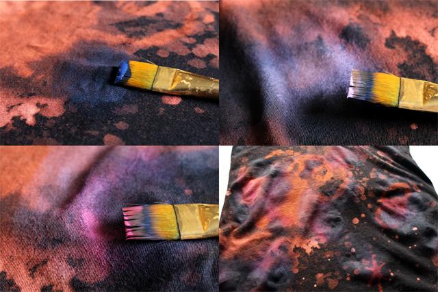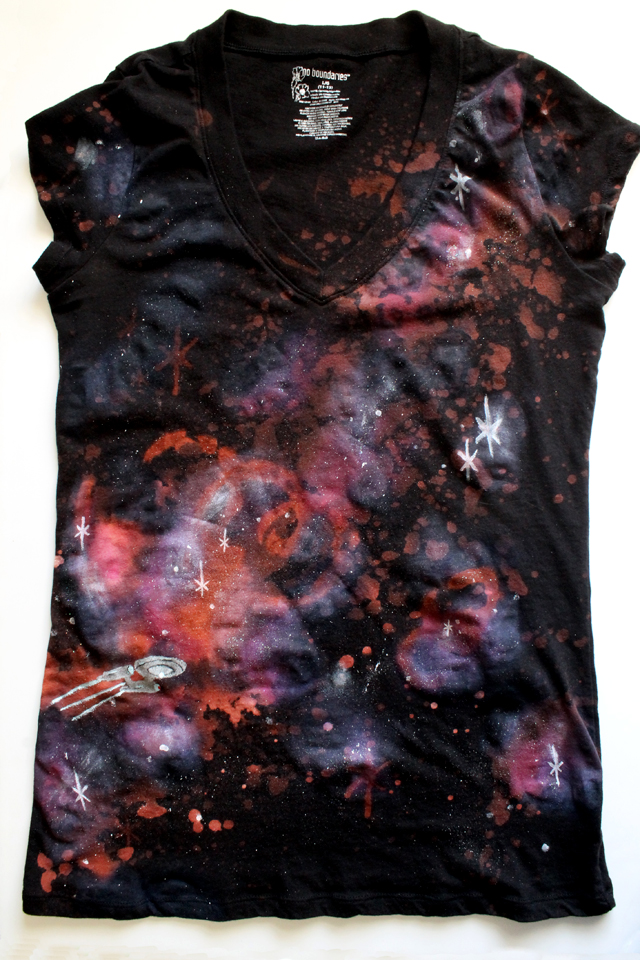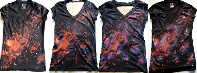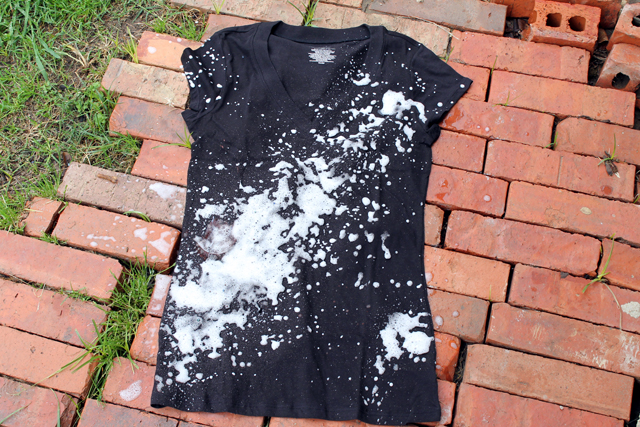 Spray bleach onto the front of your shirt. You don't want to bleach the whole thing, but you want to puddle most of the bleach in the "center" of your galaxy and spread it out from there.