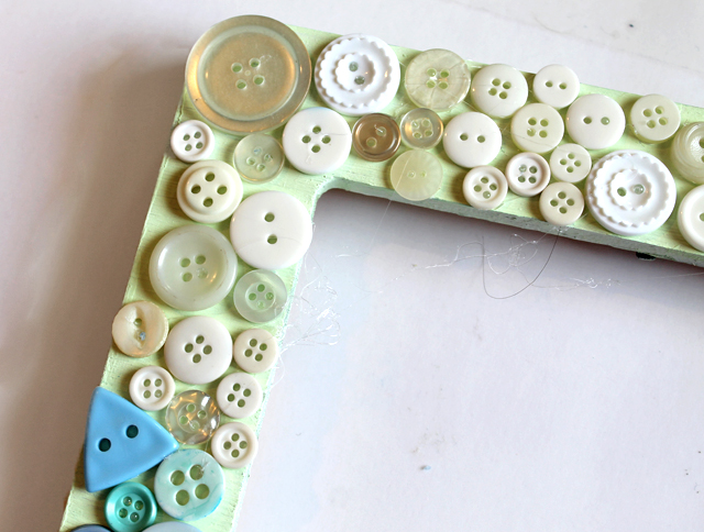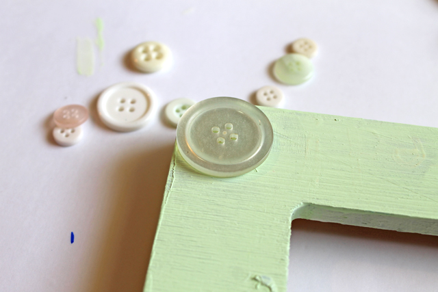 1. Paint your wooden frame. I painted mine a mint color to go behind my blue buttons. But if you're doing pink buttons, I'd go with pink or white paint.