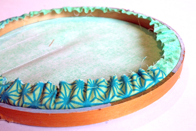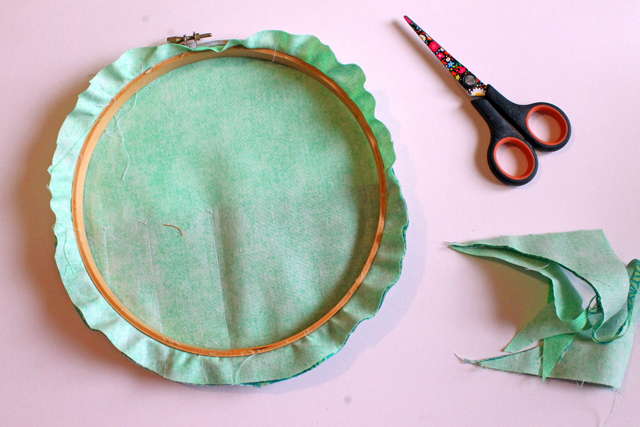 6. Flip your hoop over and trim around the edges leaving about 1" of fabric.
