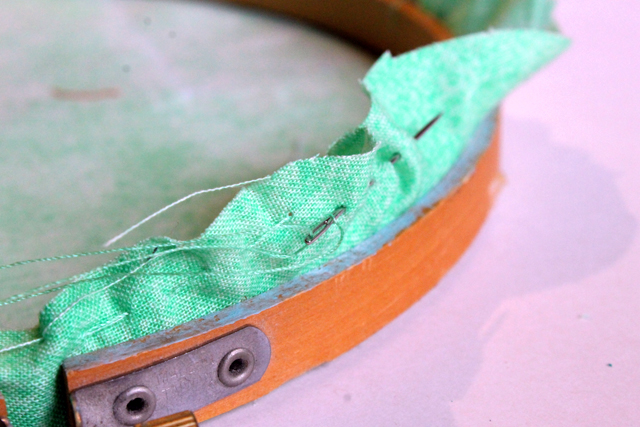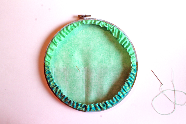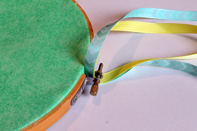 9. Cut 2 10" pieces of ribbon, and thread through the top of your embroidery hoop.