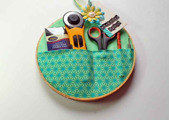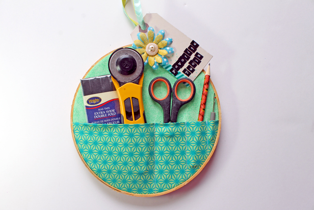 10. Thread on your tag and tie the ends closed. Use the ribbon to hang up your hoop where your tools will be handy and you know right where to find them!