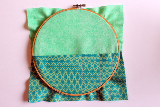 5. Place your fabric over your inner embroidery hoop, and place the outside hoop on top so that the pocket opening are facing up. Tighten it.