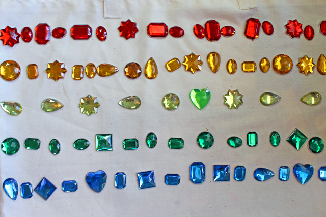 2. Arrange your rhinestones into lines on your tote bag. Starting with red and working your way down.