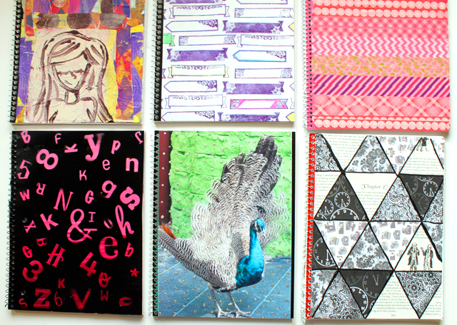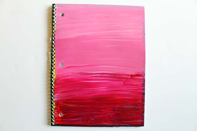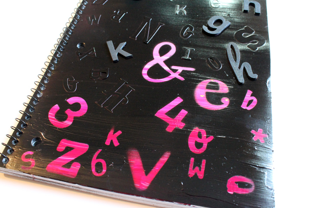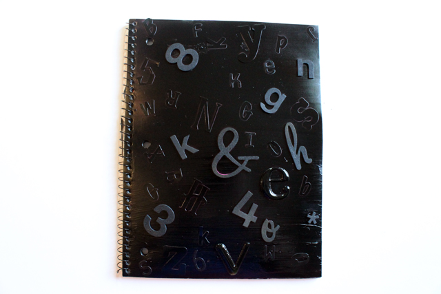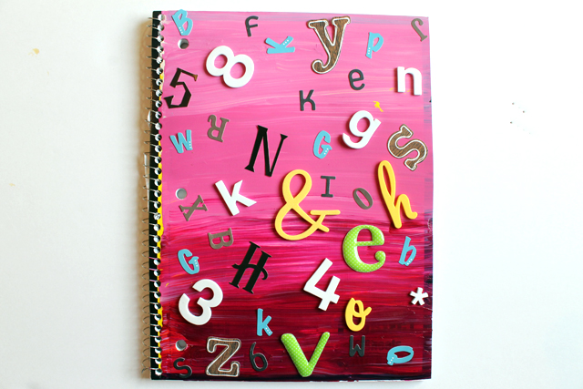 2. Once your paint is fully dry, go crazy with the letter stickers. Place them all over the front of your notebook.
