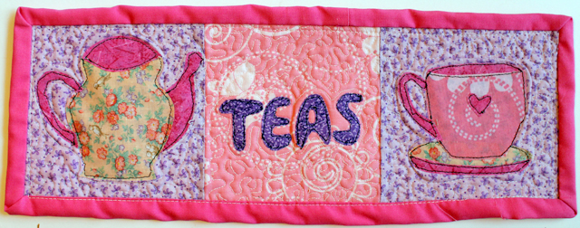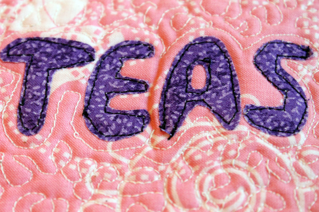 If you're a regular reader, you may know that I'm a real tea junkie. I don't like coffee, but I love tea. So, when I saw the designs in the book I was excited. I've got my new mini quilt hanging up above my little "tea bar."