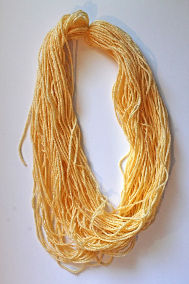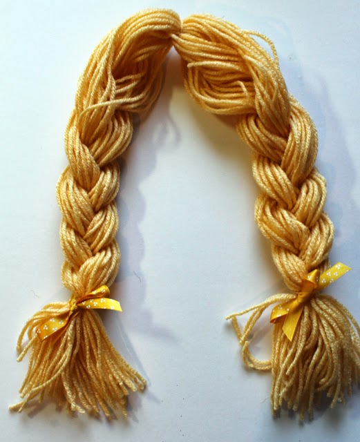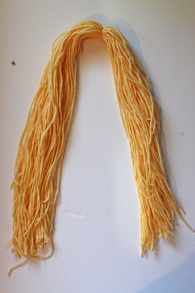 1. Wrap yarn around arms, cardboard or a chair into a 15" loop, continue wrapping the yarn until you feel it's thick enough for hair. Tie one end with a piece of yarn, cut the other end.