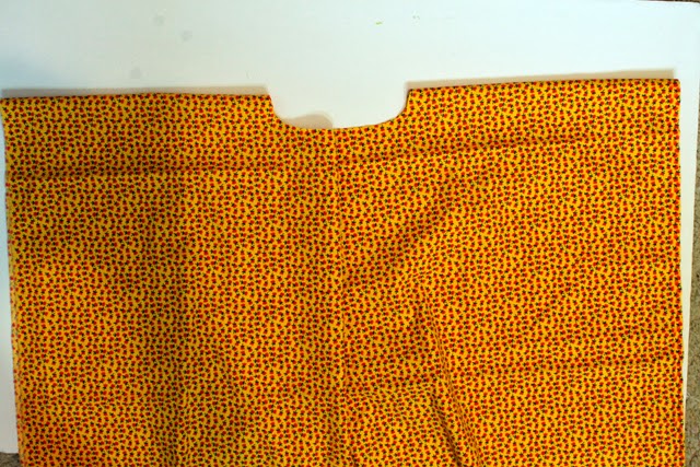 1. Fold a 32"x40" piece of fabric in half. At the center of the fold, cut a 9" circle for the neckline.
