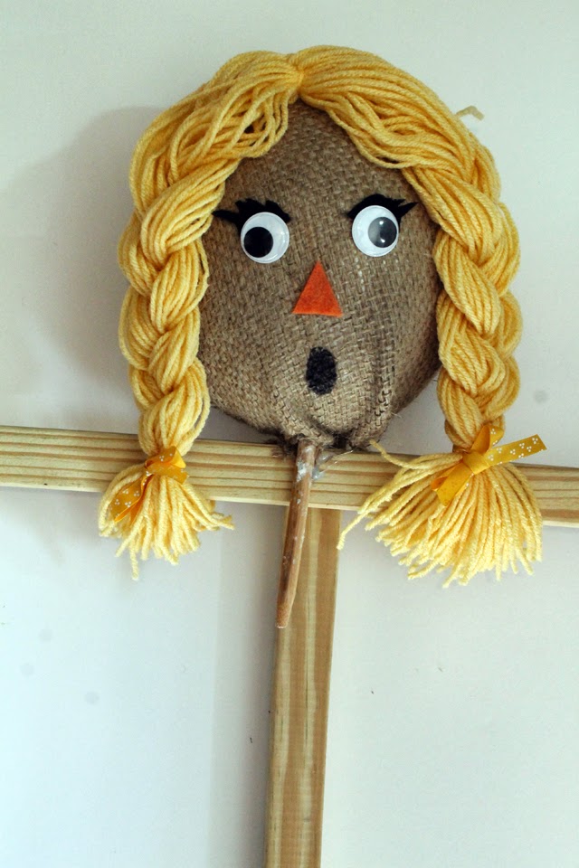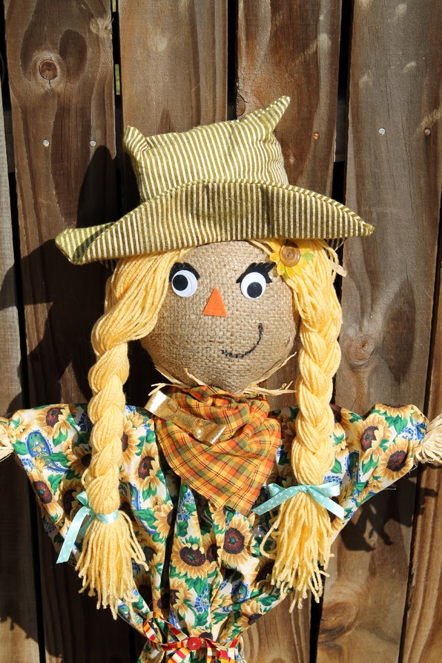 Add any extra flowers and buttons to make the scarecrow cute not creepy! :)