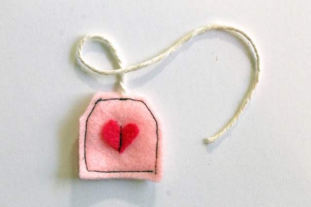 4. Cut out two 1.5x1.5" squares from felt, trim off the top 2 corners. Cut a 6" piece of twine and place the end between the 2 pieces of felt at the top. Stitch around the edges, embellish if you want. I just stitched a heart down onto it.