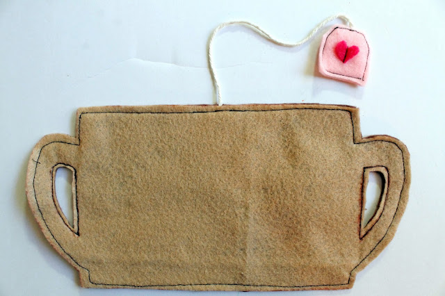 Supplies: 2 sheets of felt for the cup, Extra felt scraps for tea bag tag, Sewing machine, Paper, twine