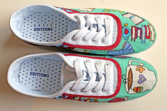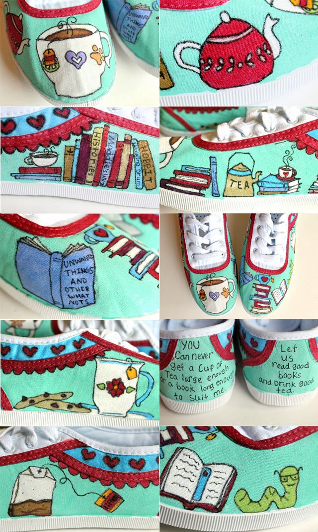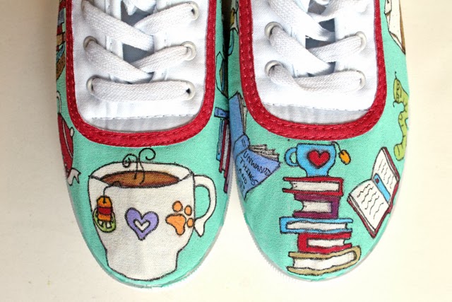 I'm excited to share these shoes with you. I love anything tea themed and these shoes have both books and tea. What could be better?