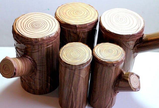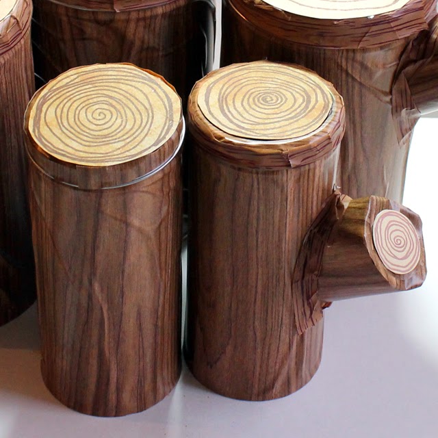 1. Cover the outside of your tins in woodgrain contact paper, Don't worry about any wrinkles, they make the tins look more "tree like".