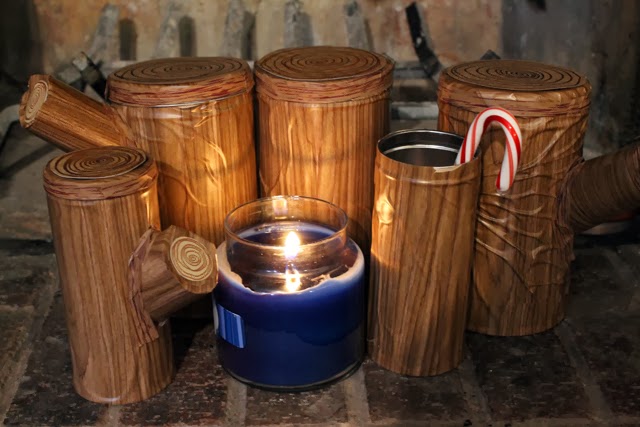 I restyled 5 empty Pirouline tins into containers that look like Yule Logs, and even after the holidays are over I have cool woodland tins! I love woodgrain contact paper, I have about 2 rolls of it so I'm always looking for projects to use it on.