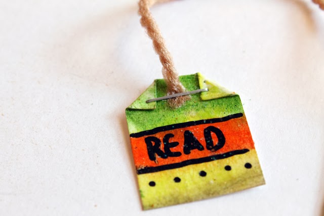 5. I also added little "tea bag tags" to my bookmarks. I cut small squares of cardstock, colored it with gelatos and markers than attached it to my bookmark like twine.