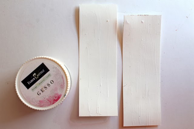1. Cut 2 bookmarks from cardstock and coat them with gesso. Let that layer dry.