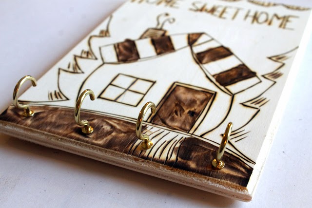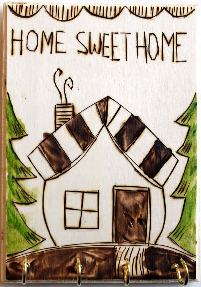 If you are wanting to make one for yourself, it's easy enough- Sketch out your design first, than burn it and screw in cup hooks at the bottom.