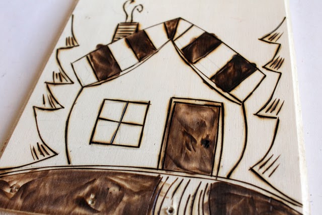 I wanted to keep it simple but also cute, so I sketched out a whimsical house and some trees with a pencil before burning it. (My dream house is a little tiny home out in the woods!)