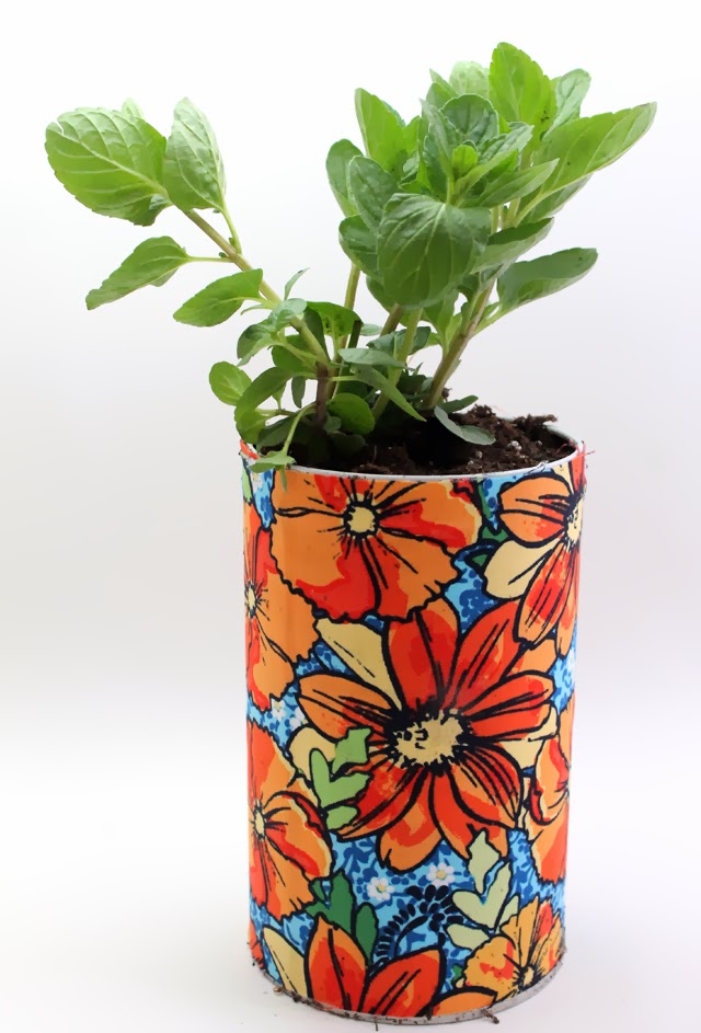 Supplies: Pirouline Tin, Drill, Spray Adhesive, Fabric, Potting Soil, Herb
