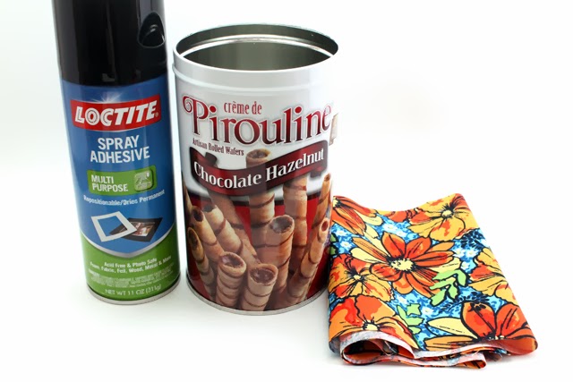 2. Cut a piece of fabric to fit around your tin. My piece of fabric was 6.5"x15" Spray the outside of your tin with spray adhesive and wrap your fabric around it.