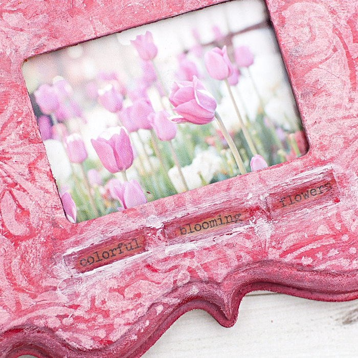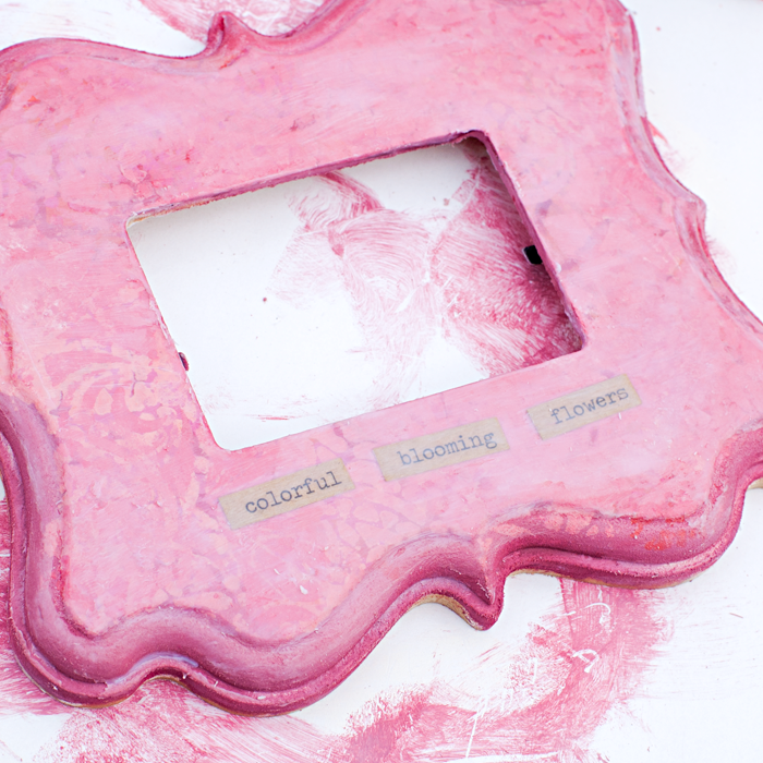 Now, you can stop here. It's totally gorgeous like this. There are some things I wanted to add to it. I found these stickers in my stash by Tim Holtz and stuck them on. I then added a layer of gel medium over the whole frame to really get the stickers on there permanently and to add some finishing touches to the frame.Then I took some more white paint mixed with a tiny bit of pink paint to add some more stenciling over the top to lighten up the frame since the red marker really made it much darker than the pink in the photo.