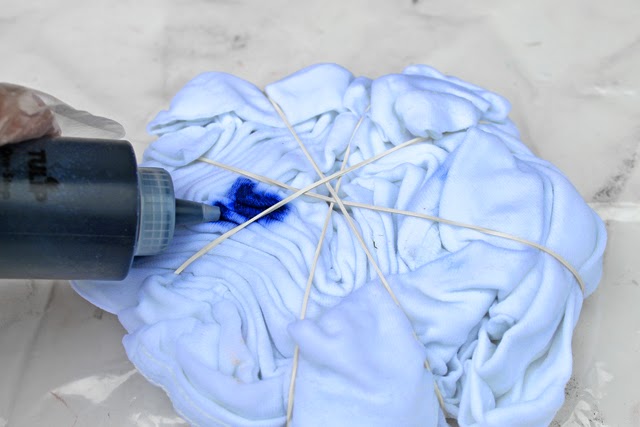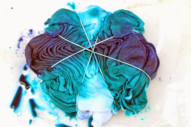 The spiral is a classic tie dye pattern, but to give it an ombre look you will want 2 dyes of the same color, just different shades. I used blue and turquoise.